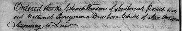 The first record naming my 5x great grandfather, Nathaniel Berryman was on 20 October 1761 when the Surry County, Virginia Court ordered that the “Church Wardens of Southwark Parish bind out Nathaniel Berriman[1], a base born child of Ann Berriman, according to law.”[2] grandfather.