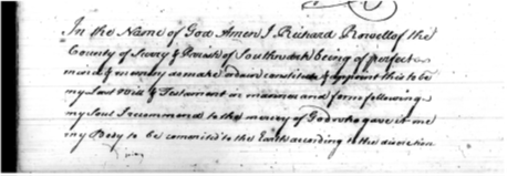 In the name of God Amen. I Richard Rowell of the County of Surry & Parish of Southwark being of perfect mind and memory do make, ordain, constitute, and appoint this to be my last will and testament in manner and form following –