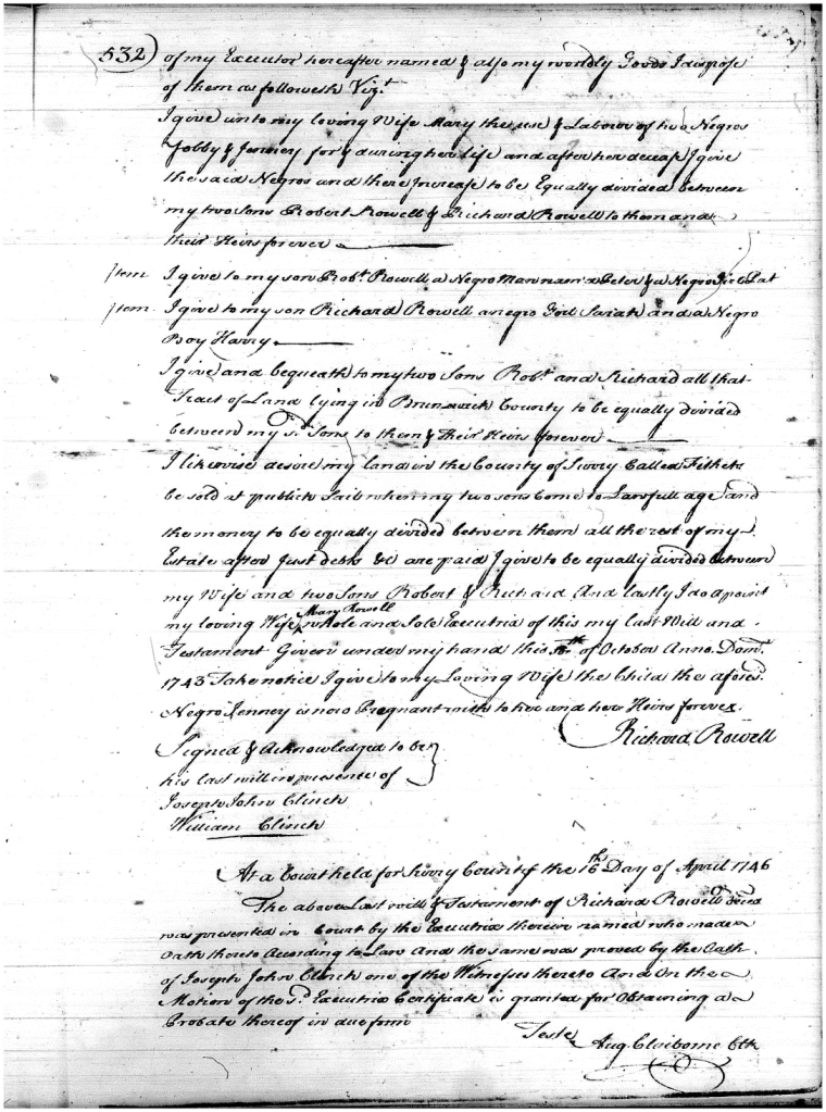 I give unto my loving wife Mary the use and labor of two Negroes Jobby and Jenney during her life and after her decease I give the said Negroes and their increase to my two sons Robert Rowell & Richard Rowell to them and their heirs forever.