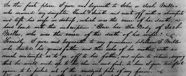 I give and bequeath to John or Jack Miller, who married my daughter Sarah A. Judith and went off with a strumpet and left his wife in distress, which was the cause of her death, a headboard with this inscription, “Here lies the body of Jack Miller, who was the cause of the death of his wife.”