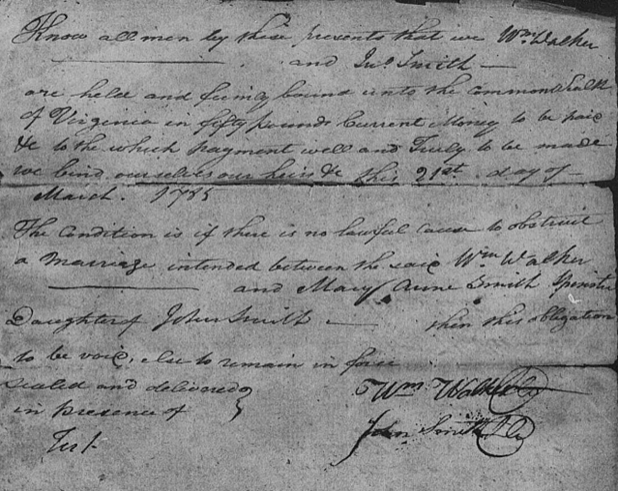 1785 Prince Edward County Marriage Bond for William Walker and Mary Anne Smith