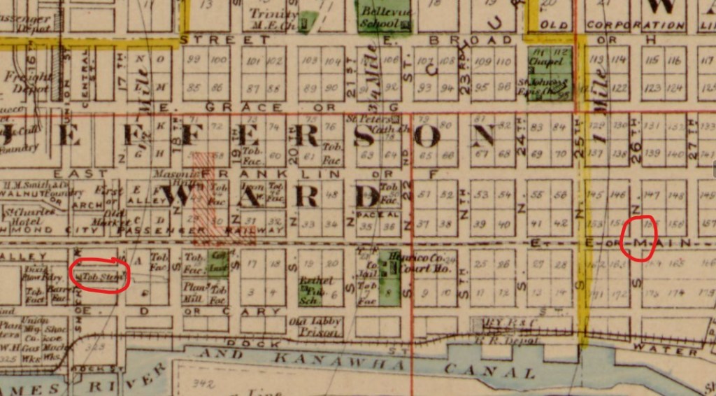 The map[27] inset below highlights the intersection in Richmond where the family was living from 1871-1873 as well as Mrs. J.S. Walker’s Tobacco Stemmery [widow of Major John Stewart Walker] on S. 17th Street. Fore those familiar with downtown Richmond today, 26th and [now E.] Main Streets is where Millie’s Diner is located. No building from that time exists on any of the four corners. The building that housed Walker’s factory at 12 S. 17th Street still stands and is now Jackson Pine Apartments.