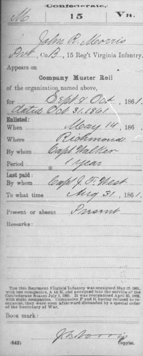 On 14 May 1861, John Rives Morris, age 20, enlisted as a private for a one-year term in the Virginia Life Guard, which had been formed in January of that year. The Guard was soon reorganized and became Company B of the 15th Regiment, Virginia Infantry.[17] Muster roll records note that John Rives Morris was enlisted by Captain John Stewart Walker – his boss at Walker’s tobacco factory.