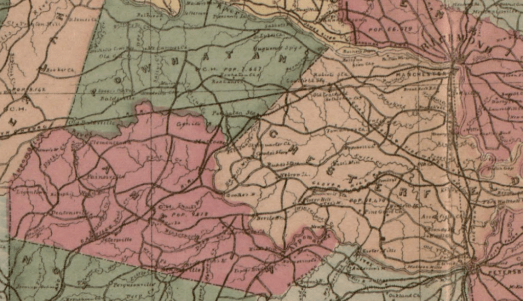 It was about this time the little family moved to Creekland Farm in Amelia County located near the village of Jetersville, which was Ann (Vaughan) Morris’ portion of the farm she inherited from her parents. The move was approximately 50 miles. The map insets below highlight both Richmond and Jetersville[29] as well as the location of the Vaughan farm[30] near the village of Jetersville.