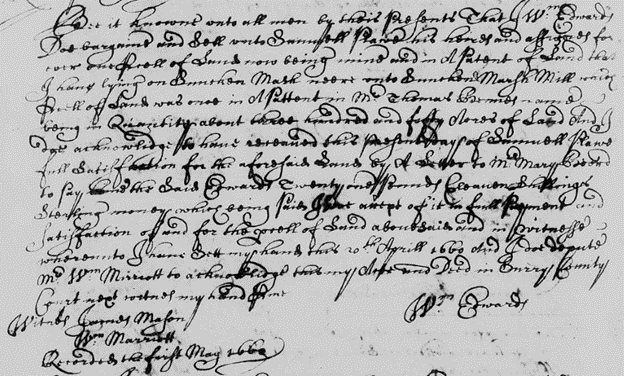 [2] Surry County Deeds, Etc. No. 1 (1652-1672), p. 154 (orig. 148); Deeds, wills, inventories, etc., 1645-1686 (familysearch.org); accessed 18 October 2022