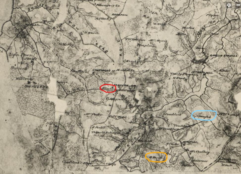 Inset of 1860s map of Amelia County. The blue circle is the location of the Vaughan farm near Jetersville. The yellow circle is the farm of Charles W. Farmer where Ann Vaughan and her sister were raised after their father died in 1851. The red circle is the Tucker place near Deatonville.[1]