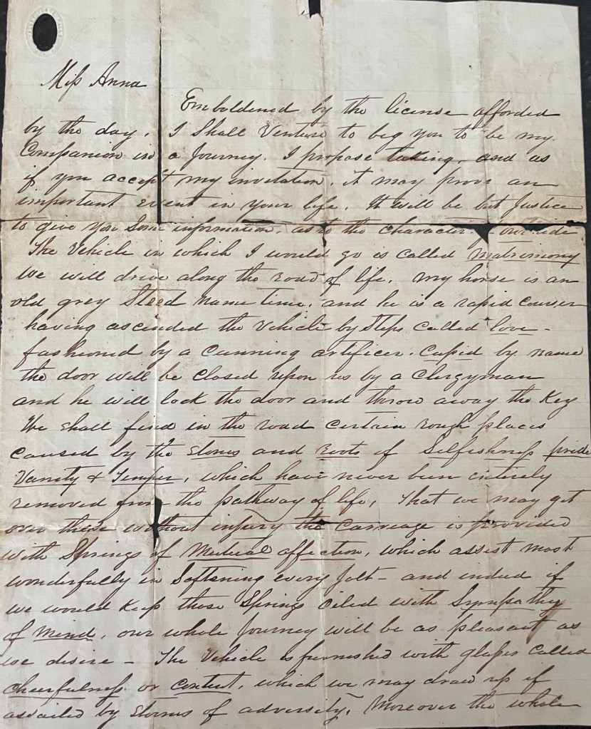 The vehicle in which I would go is called matrimony. We will drive along the road of life. Space my horse is an old gray Steed name[d] time, and he is a rapid courser having ascended the vehicle by Steps called love, fashioned by a cunning artificer, Cupid by name. The door will be closed upon us by a clergyman and he will lock the door and throw away the key. We shall find in the road certain rough places caused by the stones, and roots of Selfishness, pride, Vanity, and Temper, which have never been entirely removed from the pathway of life. That we might get over these without injury+ the carriage is provided with Springs of mutual affection which assist is most wonderfully in softening every jolt, and indeed if we would keep these Springs oiled with Sympathy of mind, our whole journey will be as pleasant as we desire. The vehicle is furnished with glasses called cheerfulness or content, which we may draw up if assailed by storms of adversity. Moreover, the whole landscape looks pleasant through the medium of those glasses. Such is their magical power.