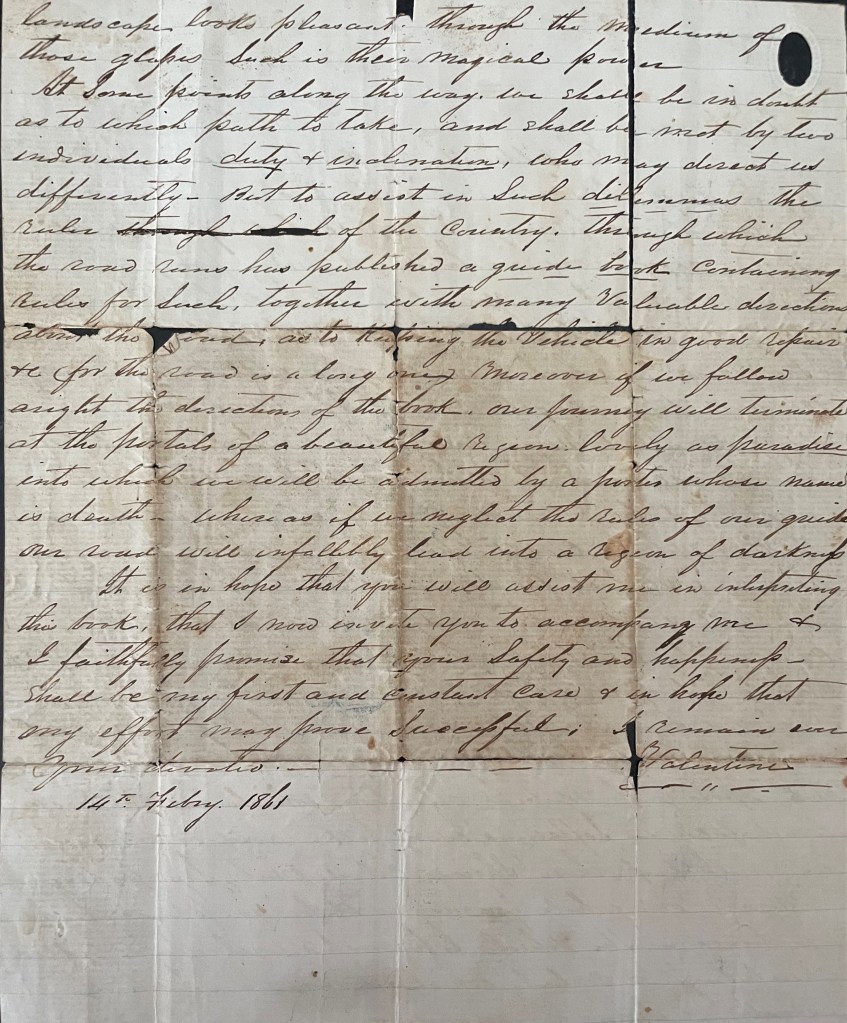 It is in hope that you will assist me in interpreting this book, that I now invite you to accompany me & I faithfully promise that your Safety and happiness shall be my first and constant care & in hope that my effort may prove successful. I remain ever your devoted Valentine