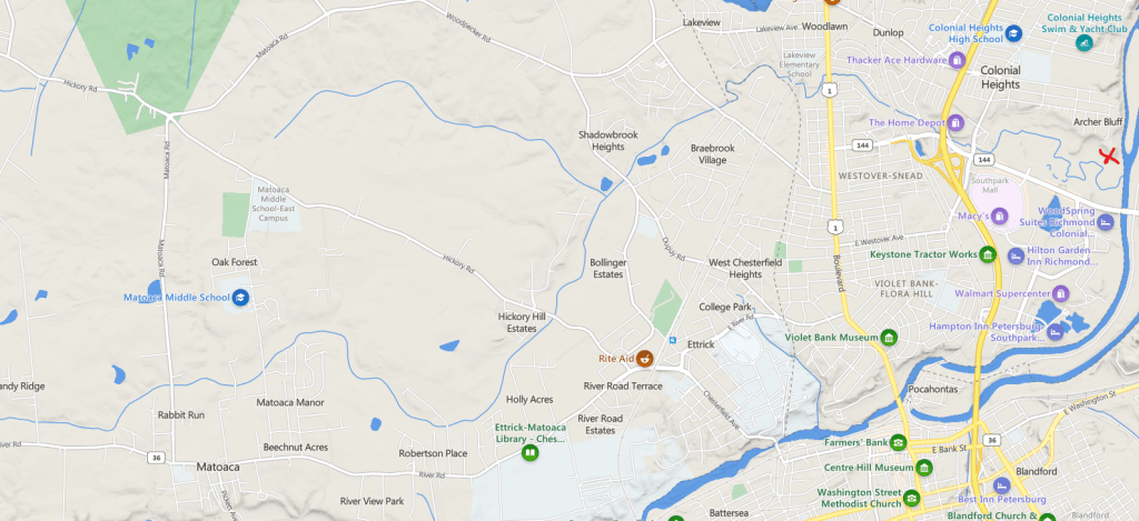 All of these tracts were then in Henrico County but fell into Chesterfield County when it was formed in 1749. The description mentioning Old Town Creek is helpful in locating the general area. Old Town Creek is a tributary of the Appomattox River rising north of Matoaca in present-day Chesterfield County and flows generally northeast through the City of Colonial Heights and into the Appomattox just north of Temple Avenue where it crosses the river. Another helpful locator is the mention of Thomas Webster’s neighbor George Archer. See the red X on the map inset below and look just above that to see Archer Bluff.