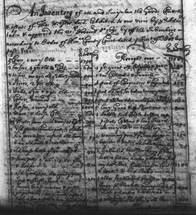 Thomas Webster was dead by 1 October 1691when the Henrico County Court ordered an inventory and appraisal (I&A) of his estate be prepared. He left no will. The I&A was recorded with the Henrico County Court on 1 February 1692/3[13] and was valued at 14,867 pounds of tobacco.[14] This is the record from which we learn his wife was Rosamond Webster.