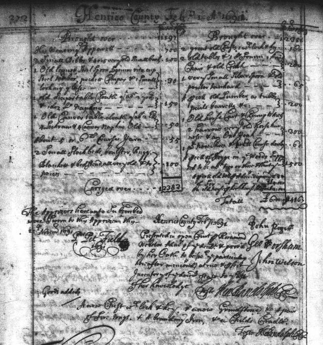 [18] Henrico County, Virginia Deeds, Wills, Etc. 1688-1697, p. 483; https://www.familysearch.org/ark:/61903/3:1:3QSQ-G9P6-S7T3?i=507&cat=397197; accessed 11 March 2023