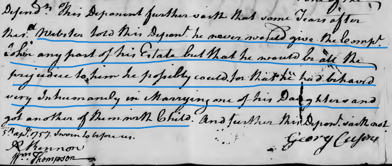 George Cousins testified that Thomas Webster II told him that he “would never give Gibbs any part of his estate as he had behaved very inhumanely in marrying one of his daughters and got another of them with Child.”