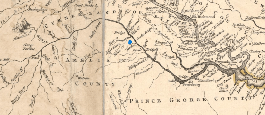 Thomas II acquired the land in Amelia County when it was still in Prince George County in the form of two grants. The first, in 1726, was for 800 acres “in the forke between Smacks Creek and Appomattox River” and the second, in 1734, was for 400 adjacent acres “on the upper side of Smacks Creek on both sides of the Wolfe Branch.” The 1734 grant mentioned adjacent landowners George Wilson, Essex Worsham, John Gibbs (Sr.) and John Garrott [8],[9] These tracts fell into the newly formed Amelia County when it was created in 1734.