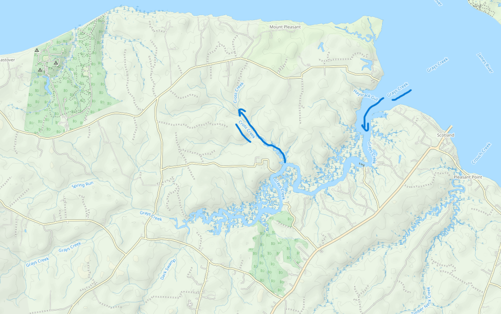 [19] Gray’s Creek, Surry County, Virginia topographical map inset; https://www.topozone.com/virginia/surry-va/stream/grays-creek-33/