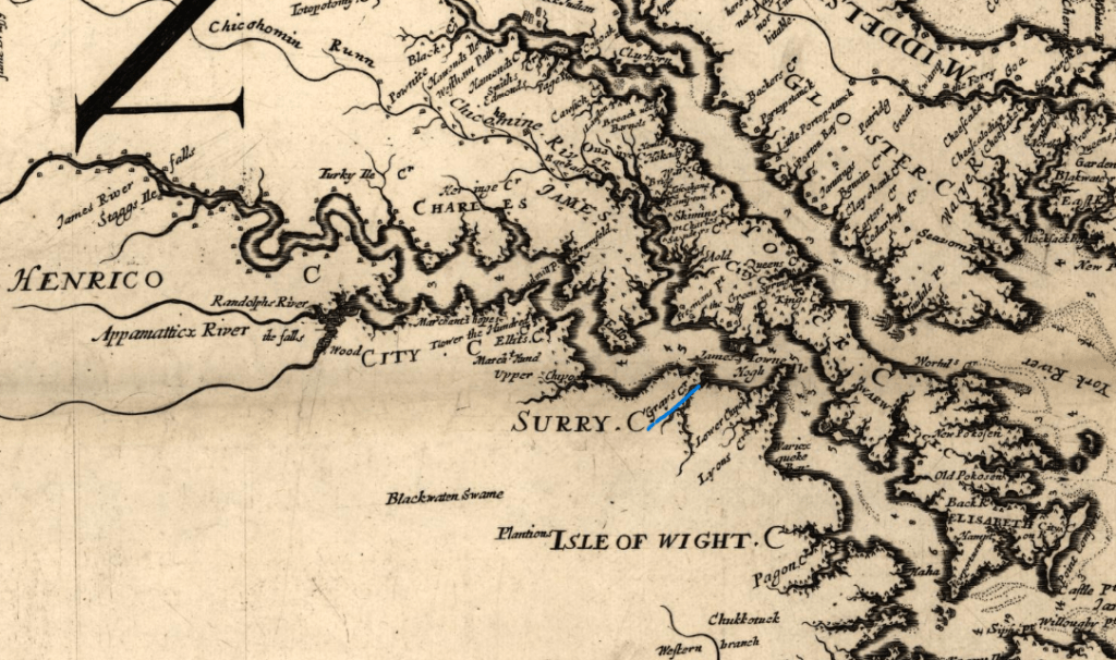 Map inset of present-day Surry County, Virginia.[19] Grays Creek (formerly called Rolfe’s Creek and Smith’s Fort Creek) and Cross’s Creek are marked in blue. Gray’s land was at the head of and on both sides of Gray’s Creek and along Cross’s Creek (both marked in blue).