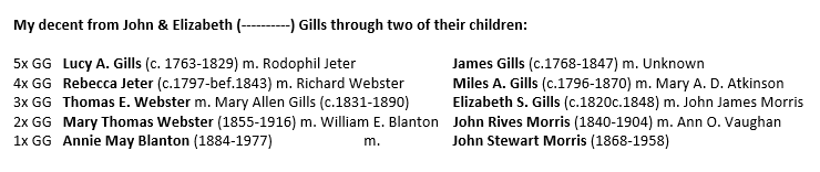 My great-grandparents John Stewart (1868-1958) and Annie May (1884-1977) (Blanton) Morris each had a grandmother who was a daughter of Miles A. & Mary A.D. (Atkinson) Gills of Amelia and Nottoway Counties. See chart below.