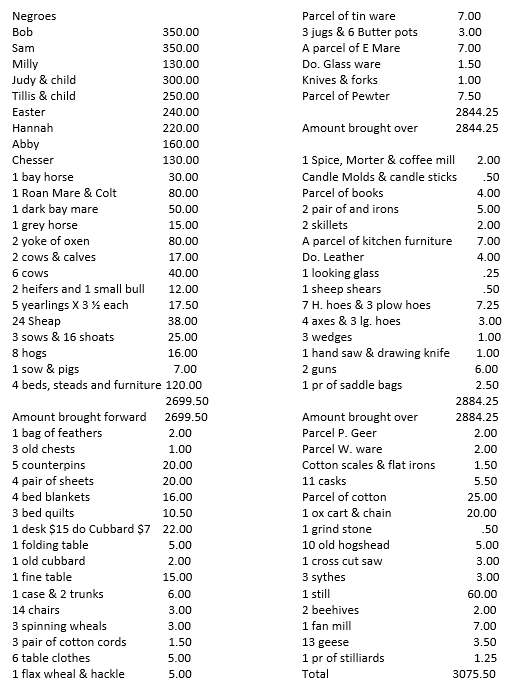 John Gills also left his son Pleasant Gills three enslaved people including Polly and her two children Dick and George. He also received some furniture and livestock. John Gills directed that his wife be lent nine enslaved people named Bob, Milley, Judy, Sam, Easter, Tillis, Hannah, Abby and Chesser. At her death or remarriage, these nine people along with any children they may have had were to be divided between all seven of John Gills children. He appointed his son William, son-in-law Rodophil Jeter and sons James and Anthony as executors. Two months later, on 28 June 1810 the inventory and appraisement of the Estate of John Gills, deceased, was presented to the Amelia County Court. Note that two of the enslaved women Judy and Tillis gave birth since John Gills will was written in 1808 so 11 enslaved people are included in his inventory.