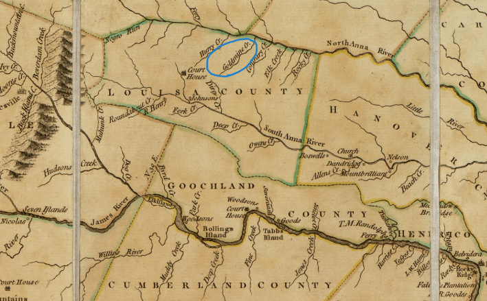 Inset of a 1770 map of Virginia with Goldmine Creek in Louisa County circled in blue.[8]