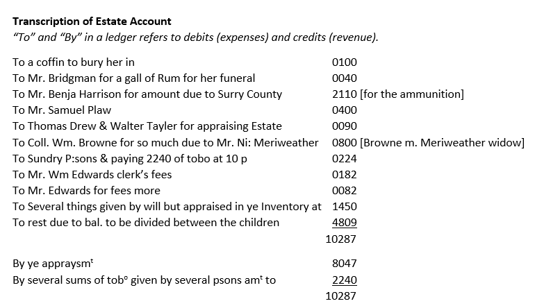 The accounting of the estate is very interesting – or rather what is not included. Previous judgments against Arthur Long for the ammunition owed to the county, to Samuel Plaw [500 pounds of tobacco] and to Nicholas Meriweather [487 pounds of tobacco] appear to be accounted for here, but not the two judgments for 1,400 and 500 pounds to Arthur Allen.