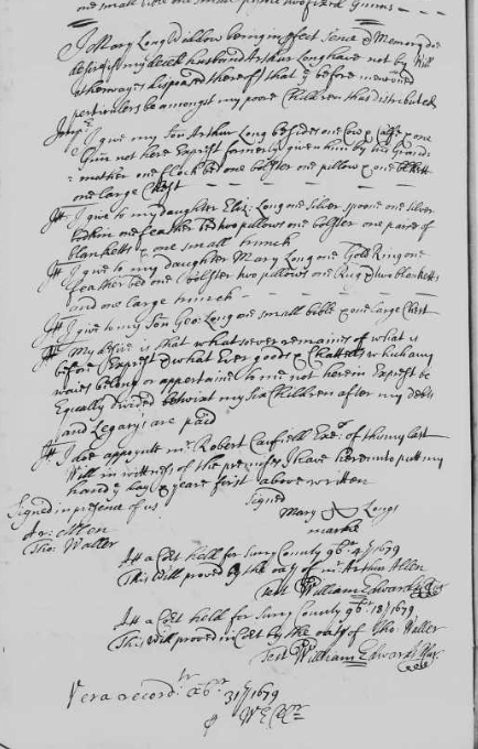 I Mary Long Widdow being in Pfect sense & memory doe desire if my deced husband Arthur Long have not by will otherways disposed thereof, that ye before mentioned perticulers be amongst my poore children thus distributed, Imp: I give my son Arthur Long besides one cow & calfe & one gun not here except formerly given him by his grandmother[19], one flock bed, one bolster, one pillow & one blanket, one large chest. I give my daughter Eliz: Long one silver spoon, one sliver bodkin, one feather bed, two pillows, one bolster, one paire of blankets & one small trunk. I give to my daughter Mary Long one gold ring, one feather bed, one bolster, two pillows, one rug & two blankets and one large trunk. I give to my son Geo: Long one small bible & one large chest. My desire is that whatsoever remains of what is before except & what ever goods & chattles which any ways belong or appertaine to me not herein expressed be equally divided betwixt my six children after my debts and legacy’s are paid I doe appoynt Mr. Robert Caufield Exer of this my last will in witness of the promises I have hereunto put my hand ye day & year first above written (no date is written above in the will book).