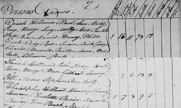 1785 – Dick Holland held 30 enslaved people named Paul, Billy, Lucy, Moll, Rachael, Beck, Nanny/Nan, Chilles, Frank, Roger, Allen, Sarah, Dick, George [Hannah], Charles, Daniel [Patt], Jean, Jan, Deavy, Harry, Quillen/Aquila [Patt], Daniel [Patt], Patt [Patt], Binah [Hannah], Nead/Ned [Hannah], Aaron [Patt], Sall [Hannah], Solomon [Hannah] and Kate.