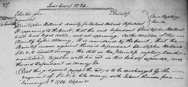 Richard Holland’s debts continued to chase him beyond his death. John Vaughan, whose case against him was abated by his death, brought suit against Richard Holland’s son Christopher Holland who was security for the debt. Christopher Holland failed to appear at the June 1784 Court session and the plaintiff was awarded £11.2.8 and his costs, which amounted to £95 lbs of tobacco. The Court further ordered that the judgement (except the costs) could be discharged by paying £5.11.4 with interest from 15 January 1784 until paid.[31] Mentioned is a replevy [replevin] bond, which was a court-assisted repossession of property and was an alternative to a detinue action in that the plaintiff could take possession of property prior to trial of the suit. A detinue action was to recover property unlawfully kept by a defendant rather than the act of taking property. This was often used by creditors to recover property pledged by a debtor but not delivered.[32]