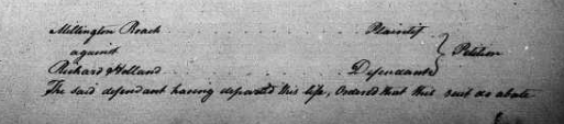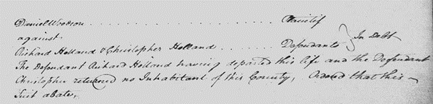Later in the June Court session Daniel Woodson sued Richard and Christipher Holland for a debt. The suit was abated noting that Richard Holland had died and Christopher Holland was not an inhabitant of the county.[33]