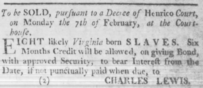 We are fortunate to have one account of the auction of the Holland’s enslaved people. From a 25 December 1801 deposition of Dabney Miller, taken a quarter of a century after the fact, Miller testified that he had been called upon by either Mr. Turner Southall or Mr. James Buchanan about the year 1775[5] to “buy some Negros in the City of Richmond which were to be sold to satisfy a debt due to Cochran & Donald & Co.” Miller added that “when the first negro was offered for sale, Mrs. Sarah Holland came up and forbid the sale and shewed a will which she said was her father’s” and that Captain Joseph Lewis[6] said that “no right could be made to the said negros.” Mr Goven, agent for Cochran & Donald & Co., said “the right of the negroes had been tried and the Court had decreed that they should be sold.” Mr. Goven also said he would “warrant and defend the rights, title, secure possession to the purchasers.” The sale was ordered to proceed.[7]