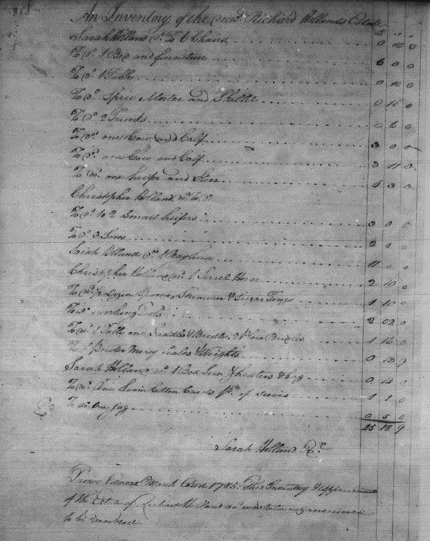 Widow and Executrix Sarah Holland filed an Inventory of Richard Holland’s estate with the Prince Edward County Court at their March 1785 session.[29]