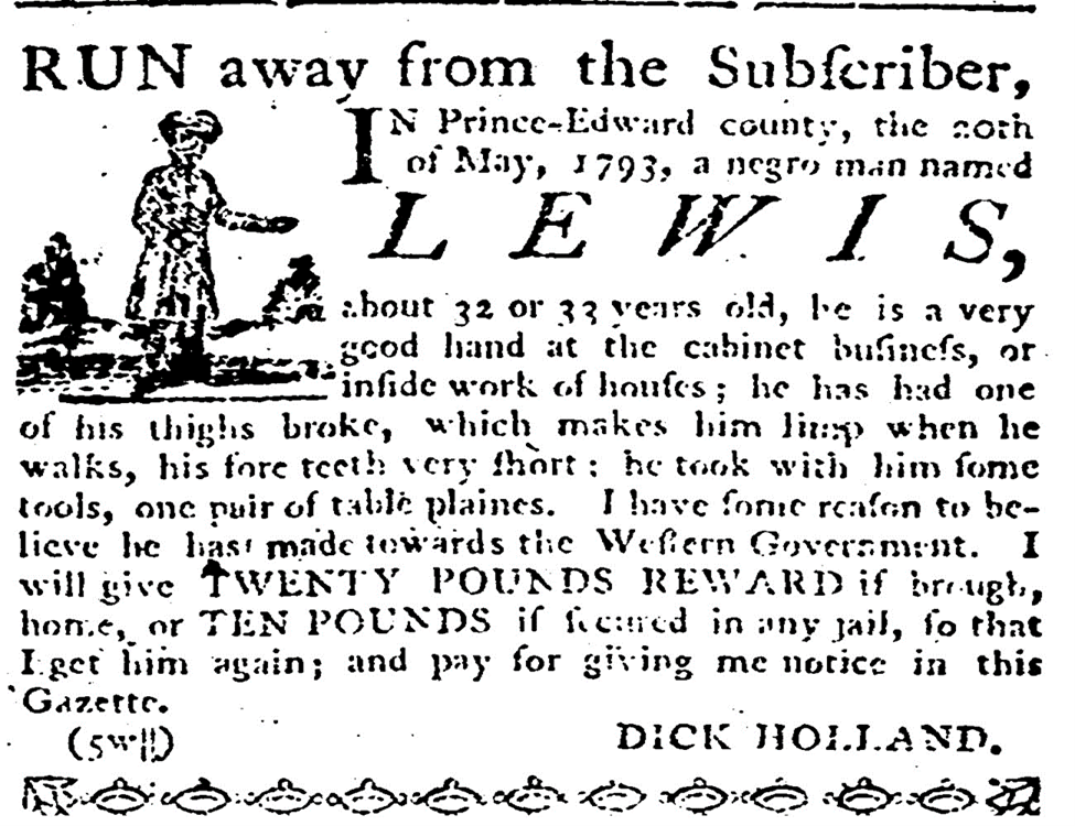 [5] Per Dick Holland the auction was held in March 1774. Bill of Dick Holland sworn in open court 26 November 1800, Holland v. Donald, Cochran & Strange (ended 1802) – U.S. Circuit Court, 5th Circuit, Richmond, Virginia, Ended Cases, restores 1801-1804, Box 18; Barcode 7420925, Stack 4, Area B, Row 70, Section 1, Shelf 4, Library of Virginia, Richmond, Virginia.