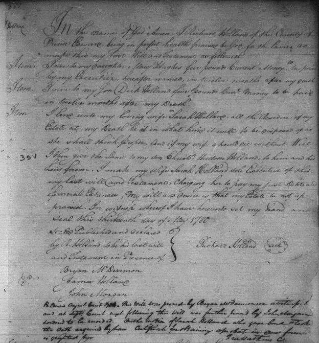 In the name of God Amen. I Richard Holland of the County of Prince Edward being in perfect health praised by God for the same so make this my last Will and Testament as followeth. I give to my daughter Mary Hughes five pounds Current Money to be paid by my Executrix hereafter named, in twelve months after my Death. I give to my son Dick Holland five pounds Currt Money to be paid twelve months after my Death. I lend unto my loving wife Sarah Holland, all the Residue of my Estate at my Death be it in what kind it will to be disposed of as she shall think proper. And if my wife should die without Will then I give the same to my son Christor Hudson Holland, to him and his heirs forever. I make my wife Sarah Holland sole Executrix of this my last will and Testament, charging her to pay my just Debts and funeral expenses. My will and desire is that my Estate not be appraised. In witness whereof I have hereunto set my hand and seal this thirteenth day of May 1780.