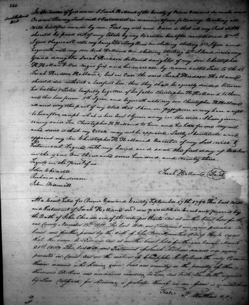 In the name of God Amen. I Sarah Holland of the County of Prince Edward do make and Ordain this my last will and Testament in the manner of form following. Revoking all wills heretofore made by me. First my will and desire is that all my just debts should be paid out of my Estate by my Executors herein mentioned. 2nd I give and bequeath unto my Daughter Mary Hues one shilling sterling. 3rd I give and bequeath to my son Dick Holland one shilling sterling. 4th I lend unto my granddaughter Sarah Hudson Holland daughter of my son Christopher H. Holland one Negro girl and her increase by name called Sall to the said Sarah Hudson Holland, but in case the said Sarah Hudson Holland should die without a lawfull heir, then they shall be equally divided between her brothers & sisters lawfully begotten of her father Christopher H. Holland to them in their heirs forever. 5th I give and bequeath unto my son Christopher H. Holland all and every other part of my Estate that I have in possession or may have a right to hereafter, except what is here lent & given away in this will. I have given to my said Son Christopher H. Holland to his and his heirs forever. My will and desire is that my Estate not be appraised. Lastly, I constitute and appoint my Christopher H. Holland Executor of my last will and testament. Signed with my hand and seal this first day of October in the year one thousand seven hundred and ninety three.