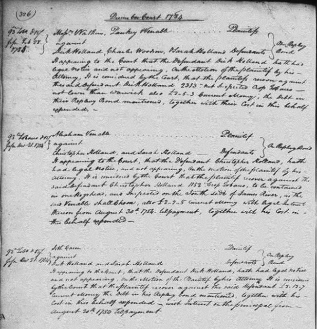 At the December 1784 court, the Hollands failed to appear to answer three debt suits and defaulted. Messrs. Watkins, Pankey and Venable were awarded 2,313 lbs of tobacco plus £2.5.3, Abraham Venable was awarded 1,152 lbs of tobacco plus £2.2.8 and Seth Casen was awarded £3.12.7. Interest and costs to bring the suit were also awarded.[35]