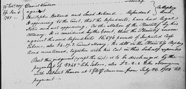 After Richard Holland’s death, Woodson revived his former suit by going after his sons Dick and Christopher Holland and their mother Sarah (Hudson) Holland. They failed to appear at the November 1784 Court and defaulted. The Court awarded Woodson 16,696 lbs of tobacco and £4.17.2 the debt on the bond. The Court allowed that the judgement could be discharged by paying 8,348 lbs of tobacco and £2.8.2 plus the plaintiff’s costs to bring the suit.[34]