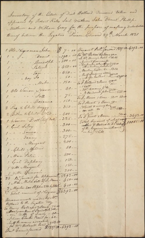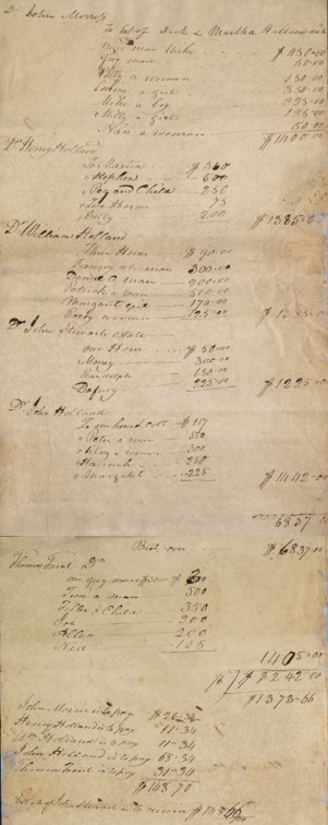 Old man John 7, Old man Daniel 190, man Randolph 500, man Patrick 450, man Tom 450, boy Jo 50, boy Mike 150, Old Woman Nann 40, old woman Poll 75, woman Roxanna 150, Peg & child Aggy 350, Tiller & child Ned 400, Doll (daughter of Doll) 325, girl Silvey 300, girl Louisa 300, girl Fanny 275, girl Margaret 200, child Mildred 80, man Peter 500, girl Daphney 150, girl Margaret 150, girl Hannah 200, man Mike sold by J. Morris 450, Martin 400 sold by H. Holland, Stephen 250 sold by H. Holland