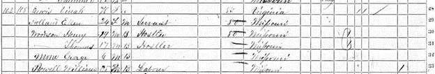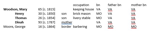 Then in 1880, I found Dinah living with her daughter Mary Woodson and listed as being 93 years old. Her grandsons Henry Woodson and Thomas Woodson were living there as well:[19]