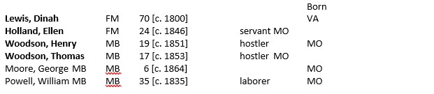 In 1870, I found Dinah Lewis, a mulatto woman, age 70, born in Virginia and unable to read or write, who headed a household in Locust Creek, Linn, Missouri. Included were:
