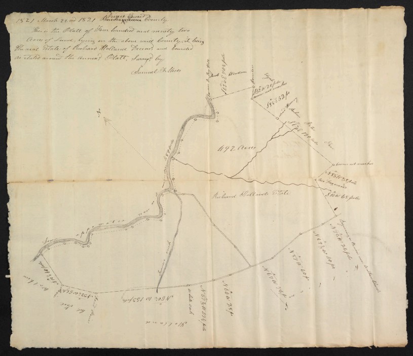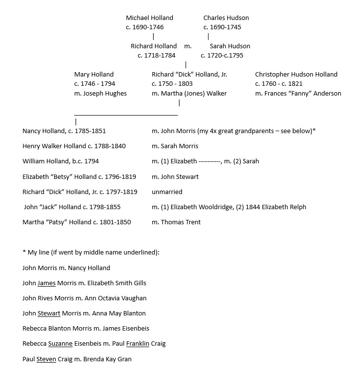 Portion of an 1820 Prince Edward County map.[4] Mrs. Holland’s and Walker’s Church at center right underlined in blue. Mrs. Holland was Martha (Jones) Walker Holland, widow of Dick Holland. This land was part of a 2,000 acre tract in Amelia County on both sides of Vaughan’s Creek patented in 1739 by Charles Hudson.[5] In his 1745 will, he directed his executors to sell 1,000 acres and lent 500 acres of this tract for life to his daughter Sarah (Hudson) Holland and another 500 to his daughter Ann (Hudson) Lewis.[6] At Sarah (Hudson) Holland’s death about 1795, her 500 acres passed to her sons Dick and Christopher Holland as directed in her father’s will. In 1802, Dick Holland’s portion was willed to his sons Henry Walker Holland and William Holland. Dick Holland’s portion was sold for debt. Center left is Rough Creek, the plantation which Dick Holland purchased and willed to his son Dick Holland, Jr. At the upper right is Morris’s Mill owned by John Morris of Buckingham who married Dick Holland’s eldest daughter Nancy. John and Nancy (Holland) Morris are my 4x great grandparents.