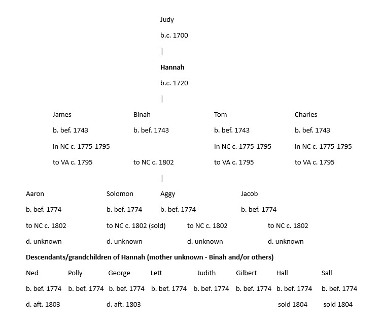Remember the 10 enslaved men mortgaged by Dick Holland that Donald & Cochran had finally won the forced sale of back in 1802? Eight of the 10 men were included in Dick Holland’s 1821 inventory. Perhaps it is a coincidence that of the eight men accounted for therefore not sold in 1802, six were descendants of Patt and/or Hannah. Of the four men not known to be descendants of Patt or Hannah, we know nothing of the fate of Cezar or Jerry, and Micheal, although found in Dick Holland’s 1821 inventory, is listed as “sold by J. Morris.”