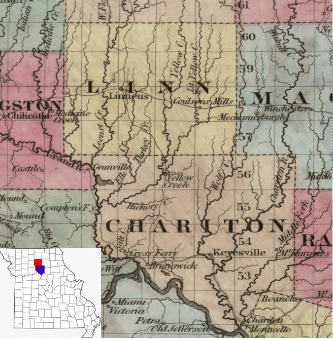 Inset of 1851 Map of Missouri.[14] Note Linneus and Locust Creek in western part of Linn County (John Holland) and Keytesville in eastern Chariton County (Henry Walker Holland and William Holland)