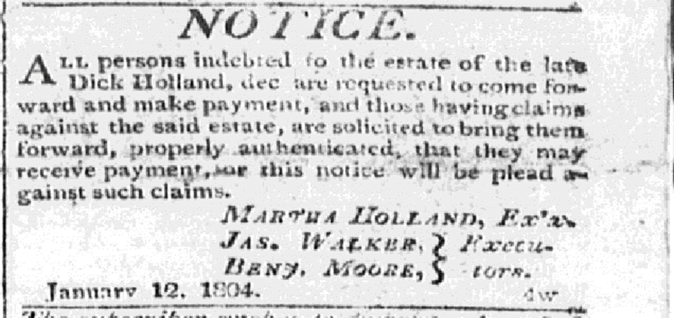 We ended part 3 with the 1802-3 death of Dick Holland and his last will and testament wherein he appointed “my dearly beloved wife Martha Holland Doct. James Walker [Martha’s son from her first marriage to Henry Walker] and Benjamin Moore Executors” Then just like his parents, Dick Holland added “my will and dezire [sic] is that my Estate shall not be appraised.”
