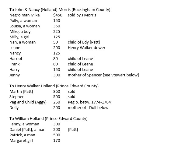 Edy [Patt] and Jenny were among those enslaved women Dick Holland willed to his wife in 1802 for her life and then empowered her to decide how they and their “increase” should be divided among his children. Edy [Patt] appears to have died before the 1821 inventories of Dick and Martha (Jones) Walker Holland were made. Her children Martha, Friday, Nancy, Lewis and John were all willed to Nancy (Holland) Morris by Martha (Jones) Walker Holland in 1820. The Morris’ lived in Buckingham County and owned Cutbanks plantation in Prince Edward County. I was not able to find out anything about the fates of Edy’s children.