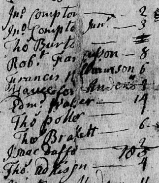Thomas3 Atkinson’s brother-in-law John Compton was also deposed on 6 February 1778. He testified that shortly after John2 Atkinson’s 1748 death, he heard Thomas3 Atkinson say that “his father had left to him a Negro fellow named Tom and to his sister Nancy a Negro girl named Jude and to each of the other children a Negro but that this deponent always understood that the said John Atkinson father of the defendant died without will.” Compton added that “upon a Negro being recovered out of the Estate” that Charles Atkinson had “sent for him to come to him and repay him his proportion of the said slave as he said he had received his part of the appraised value of the said slave before the recovery thereof.”[36]