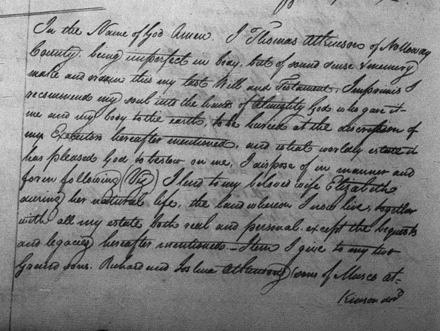 In the Name of God Amen. I Thomas Atkinson of Nottoway County being imperfect in body but of sound sense & memory make and ordain this my last Will and Testament.