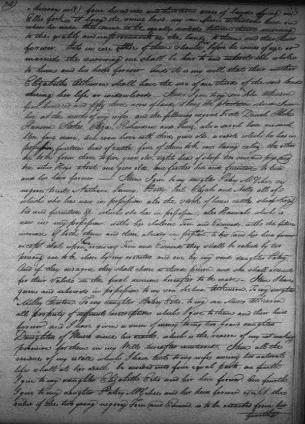 Imprimis I recommend my soul into the hands of Almighty God who gave it – me and my body to the earth, to be buried at the discretion of my Executors hereafter mentioned, and to that worldly estate it has pleased God to bestow on me, I dispose of in manner and form following (Viz) I lend to my beloved wife Elizabeth during her natural life, the land whereon I now live, together with all my estate both real and personal except the bequests and legacies hereafter mentioned. – Item. I give to my two grandsons Richard and Joshua Atkinson (sons of Musco Atkinson dec’d) four hundred and thirteen acres lying on Ellis Fork it being the same land my son Musco Atkinson lived on when he died, the same to be equally divided between them according to the quality and improvements on the land, to them and their heirs forever, but in case either of them should die before he comes of age or married the surviving one shall be heir to and inherit the whole to him and his heirs forever. And it is my will that their mother Elizabeth Atkinson [Muscoe’s widow] shall have use of one third of the said land during her life or widowhood. Item. I give to my son John Atkinson four hundred fifty three acres of land it being the plantation whereon I now live at the death of my wife and the following Negroes to wit: Daniel, Phoebe, Ransom, Stokes, Eliza, Richardson and Lewis, also a sorrel horse, one sorrel close(?) face mare, one roan horse colt three years old, a saddle which he has in his possession, fourteen head of cattle, four of them cows leaving calves, the other six to be from three to five years old [only adds up to 10], eight head of sheep, two sows and pigs and ten other hogs about one year old, one feather bed and furniture to him and his heirs forever.