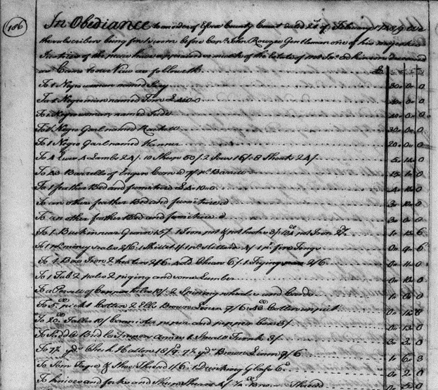The following day on 21 March, Charles2 Atkinson returned John2 Atkinson’s estate inventory &appraisal (I&A), which had been ordered by the Essex Court on 21 February 1748/9.[11] His estate was valued at £273.0.10 of which £175 was the value of the enslaved Sary £30, Tom £40, Jude £40, Rachell £30, Hanner £20 and Jamey £15. The balance of the estate was typical – comprised of furniture and household goods, farm tools and livestock.[12]