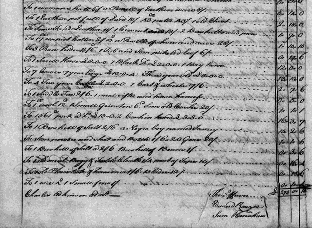 The second filing covered 1748 – April 1751 and was recorded on 16 April 1751. Included are four incurred expenses for 1748, which related to that year’s crop – tobacco and corn – as well as “attending and selling the Estate 5 days.” In 1749, Atkinson recorded an expense for “delivering one Negro woman” and “my wife’s attending her in child bed.” There are also numerous entries for clothes for the orphans. For 1749, expense for “making Thomas Atkinsons Linen Clothes” and also for Thomas “1 pr stockings & 1 pr gloves.” John and Henry also received linen clothes and Henry, the youngest also received “1 pr of small shoes.” Also recorded for 1749 was “Rent paid Mr. Boughan,” which is for the farm the family rented. An expense for “Physick for the Negros” and payment to “Ann Atkinson [this is likely John’s daughter Nancy] for attending in their illness” and “making 4 shirts and 3 frocks for Negro children” round out the expenses for the year. In 1750 he recorded an expense for “boarding John & Henry Atkinson,” clothing expenses for the Atkinson children and the enslaved as well as expense for “smith’s work.” With respect to income, corn was the principal crop. Brandy was also produced and sold.[17] Notably no boarding was paid for Thomas Atkinson.
