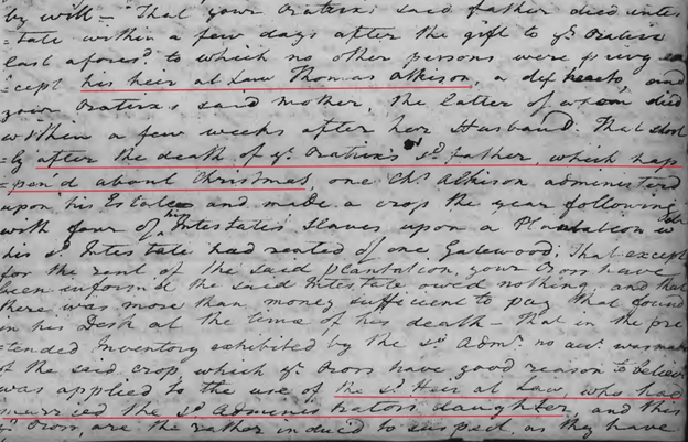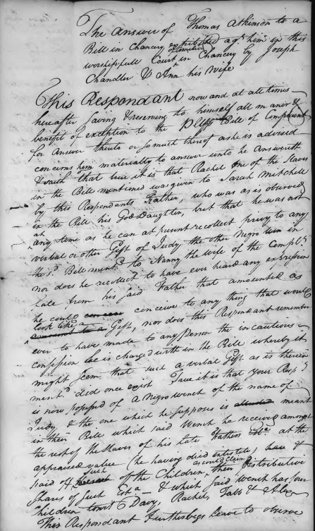 The Chandlers alleged that her father John2 Atkinson promised Nanny3 an enslaved girl named Rachel, but that he instead gave Rachel to his goddaughter Sarah Mitchell. The Chandlers recalled a conversation that occurred a few days before her father’s death when her mother pointed out to her husband that he had already promised to give Rachel to Nanny. Her father was alleged to have said he would give Nanny a “better slave named Judy who was Rachel’s elder sister then about 15 years of age.” Her father died intestate a few days later and his wife a few weeks after that. The only witnesses to the conversation were their now deceased parents, the defendant Thomas3 Atkinson, who then was about age 17 and Ann “Nancy/Nanny”3 Atkinson, then about age 13.
