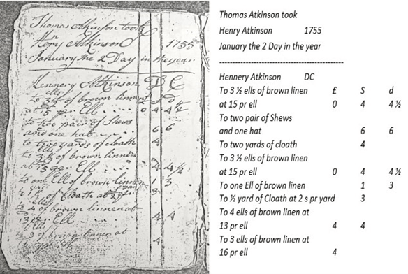 Thomas and ——— (Atkinson) Atkinson had sons Muscoe4, b.c. 1753[21] and Joshua4, b.c. 1755.[22] A 1755 entry an account book of Thomas3 Atkinson’s references his youngest brother Henry3 Atkinson who was about 10 years old at the time. The balance of the page was devoted to the items Thomas sold young Henry on credit from his store. An English “ell” was a length of linen of about 1 ¼ yards.[23] Henry was being provided with the material with which new clothes would be made. He is not included with the rest of his siblings in a 1772 Amelia County Chancery court case suggesting he died young.