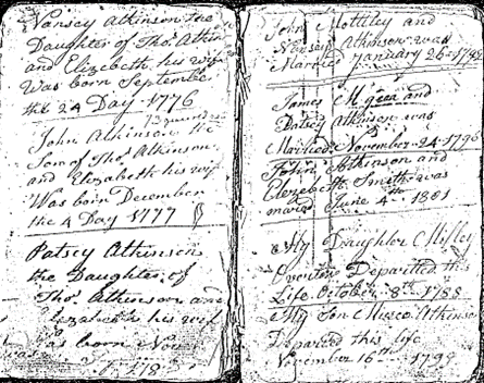 Thomas and Elizabeth (Dupuy) Dixon Atkinson soon had three children including daughter Ann4, called “Nancy”, born 24 September 1776, son John4 Atkinson, born 4 December 1777 and daughter Martha4, called “Patsy”, born in November 1778.[31]